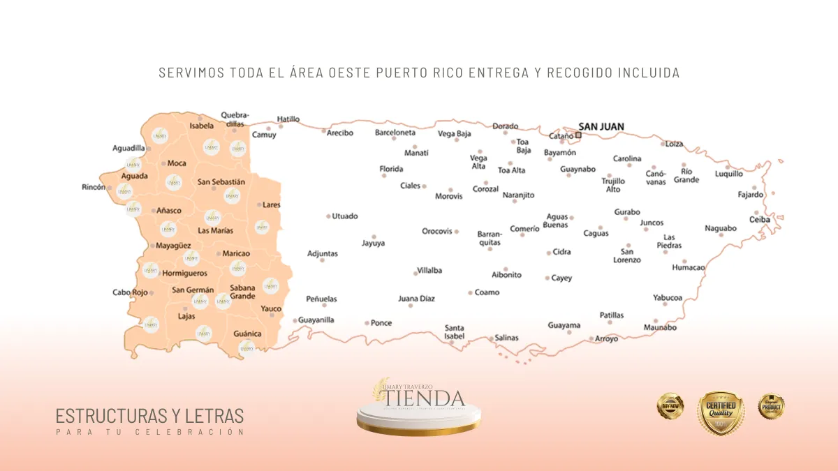 Ofrecemos decoraciones, estructuras y letras personalizadas en toda el área oeste de Puerto Rico: Mayagüez, Aguadilla, Añasco, Cabo Rojo, Hormigueros, Isabela, Lares, Las Marías, Moca, Rincón, San Germán, San Sebastián, Sabana Grande y Lajas.